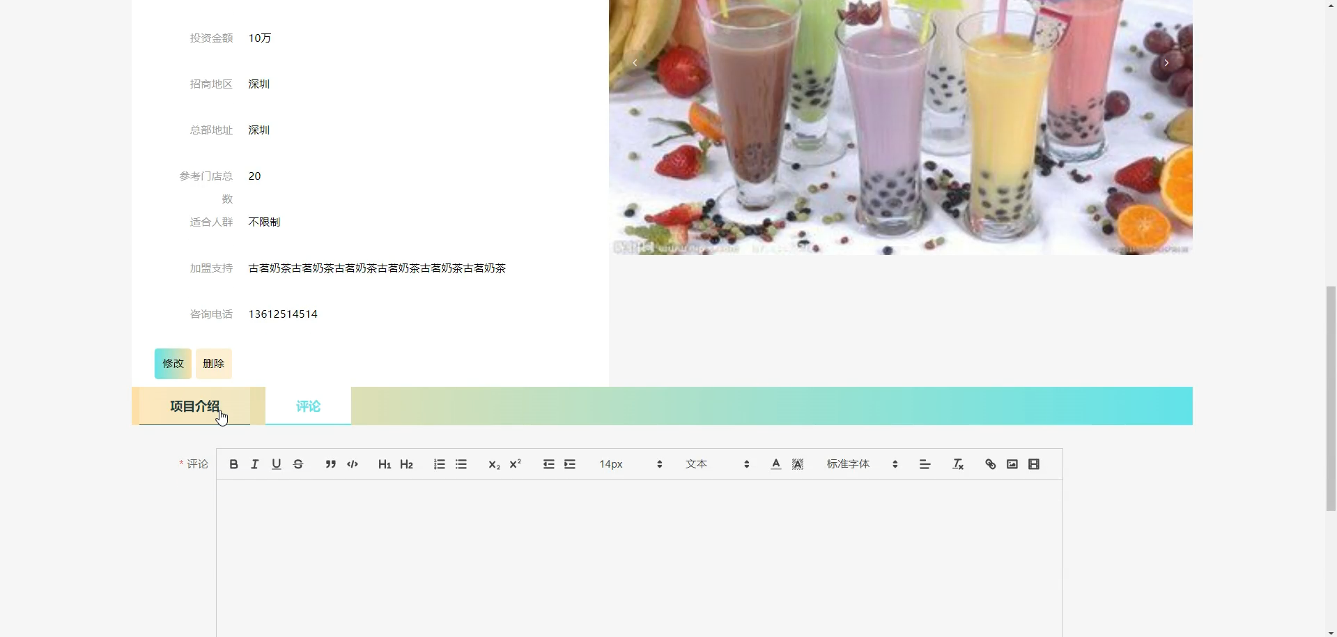 品牌管理: 对加盟品牌进行增、删、改、查(CRUD),包括品牌名称、LOGO、所属行业、投资额度、简介等。
