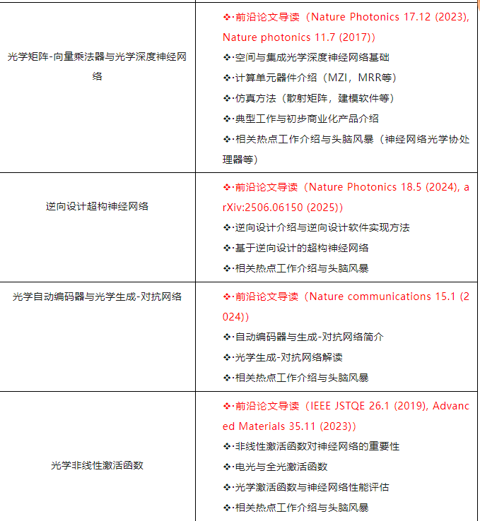 1.光学神经网络架构创新:从空间光衍射神经网络的并行计算优势,到片上集成网络的微型化突破,实现了从宏观到微观尺度的算力升级。