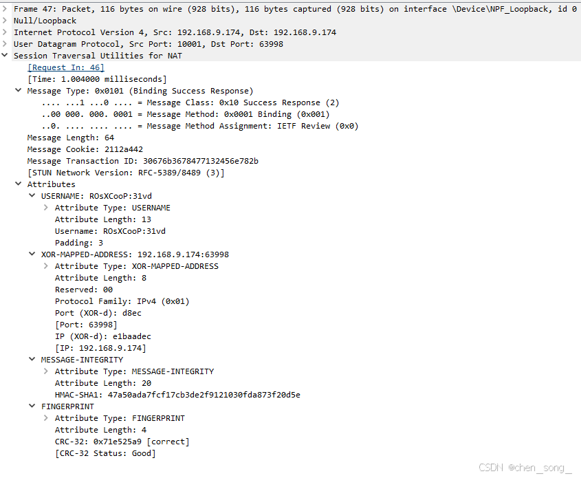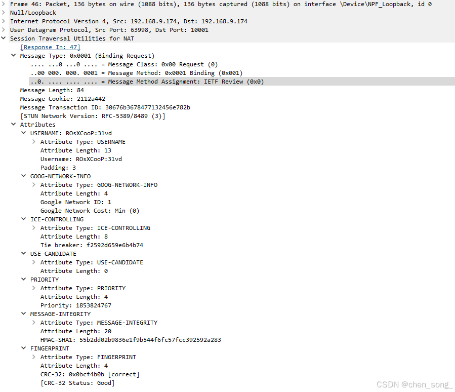 - STUN协议的验证 Binding Request 0001 (USERNAME、GOOG-NETWORK-INFO、ICE-CONTROLLING、USE-CANDIDATE、PRIORITY、MESSAGE-INTEGRITY、FINGERPRINT)