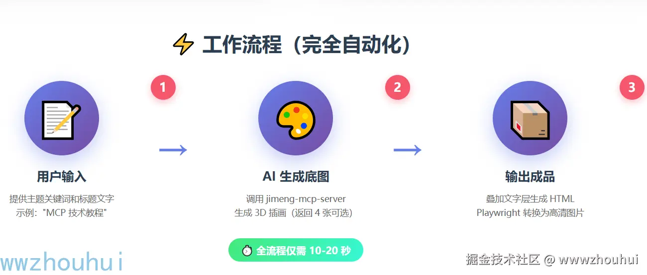 这个流程完全自动化,从输入到输出只需要 10-20 秒,效率极高。