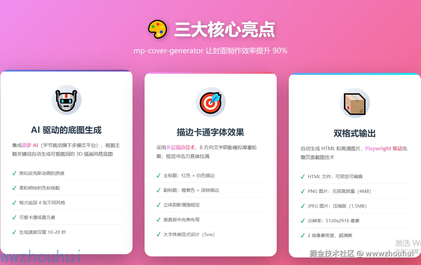 mp-cover-generator(公众号封面生成器)是一个基于 AI 技术的自动化封面图生成工具。它的核心理念很简单:让内容创作者专注于内容本身,而不是在设计上浪费时间。