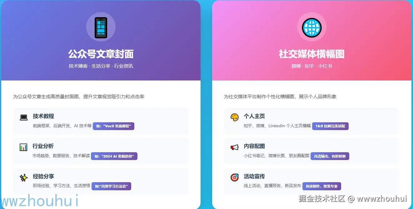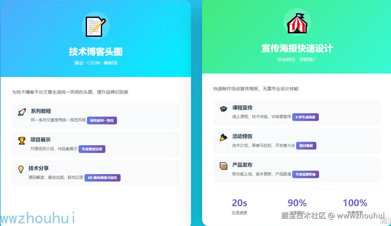 你是不是经常为了做一张公众号封面图而烦恼?打开PS或者Figma,调色、排版、找素材,折腾大半天还不一定满意。更糟糕的是,有时候灵感来了想立刻发文,却被封面图卡住了进度。作为一个技术博主,我深有体会------我想专注于写作和分享技术,而不是在设计工具上耗费时间。