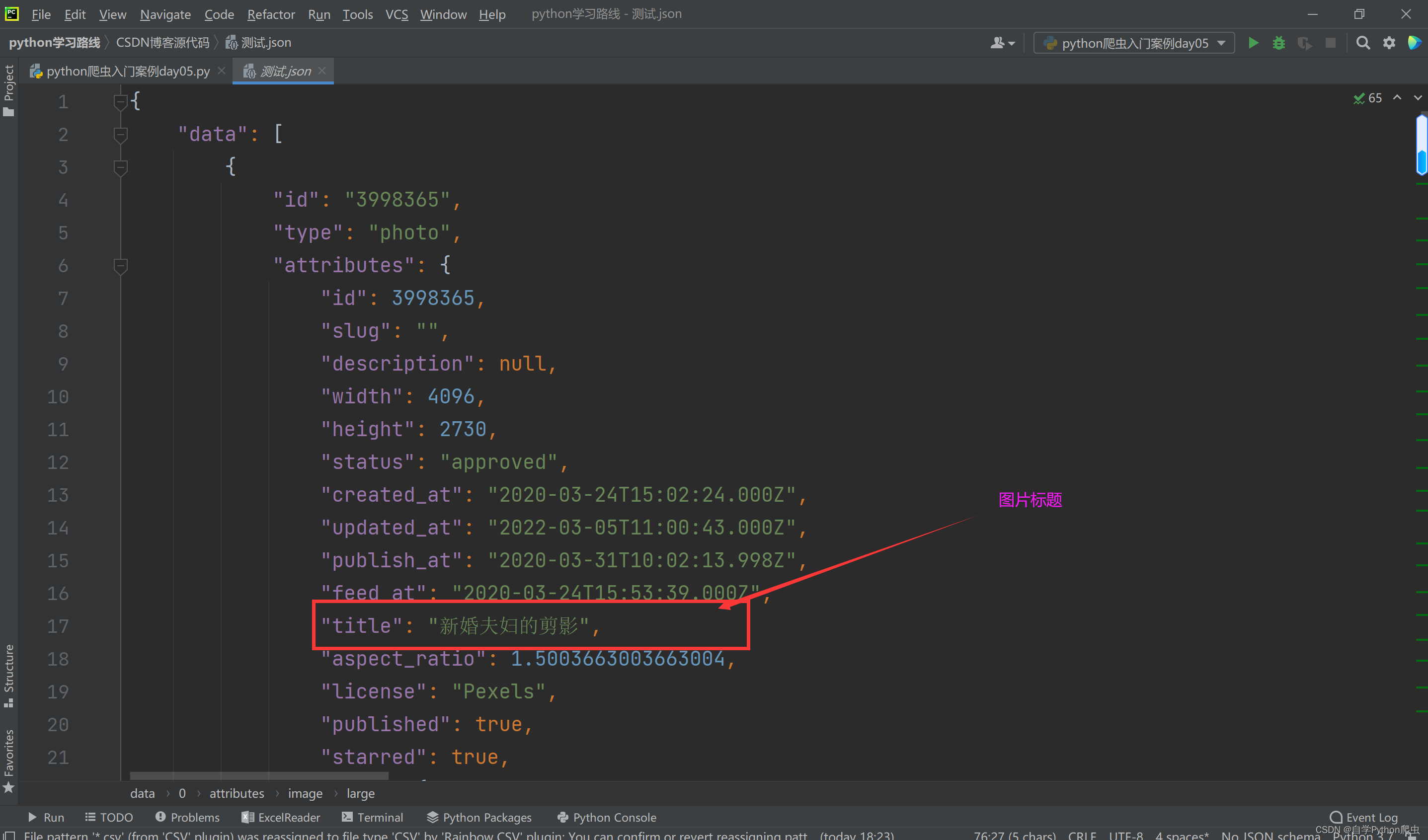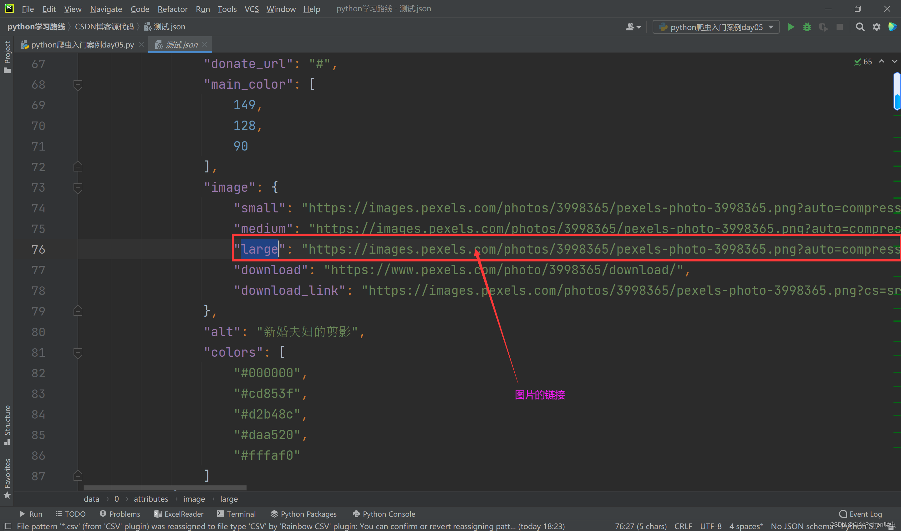 3、使用jsonpath.jsonpath()方法来对json格式数据进行解析提取出图片名称和图片链接;