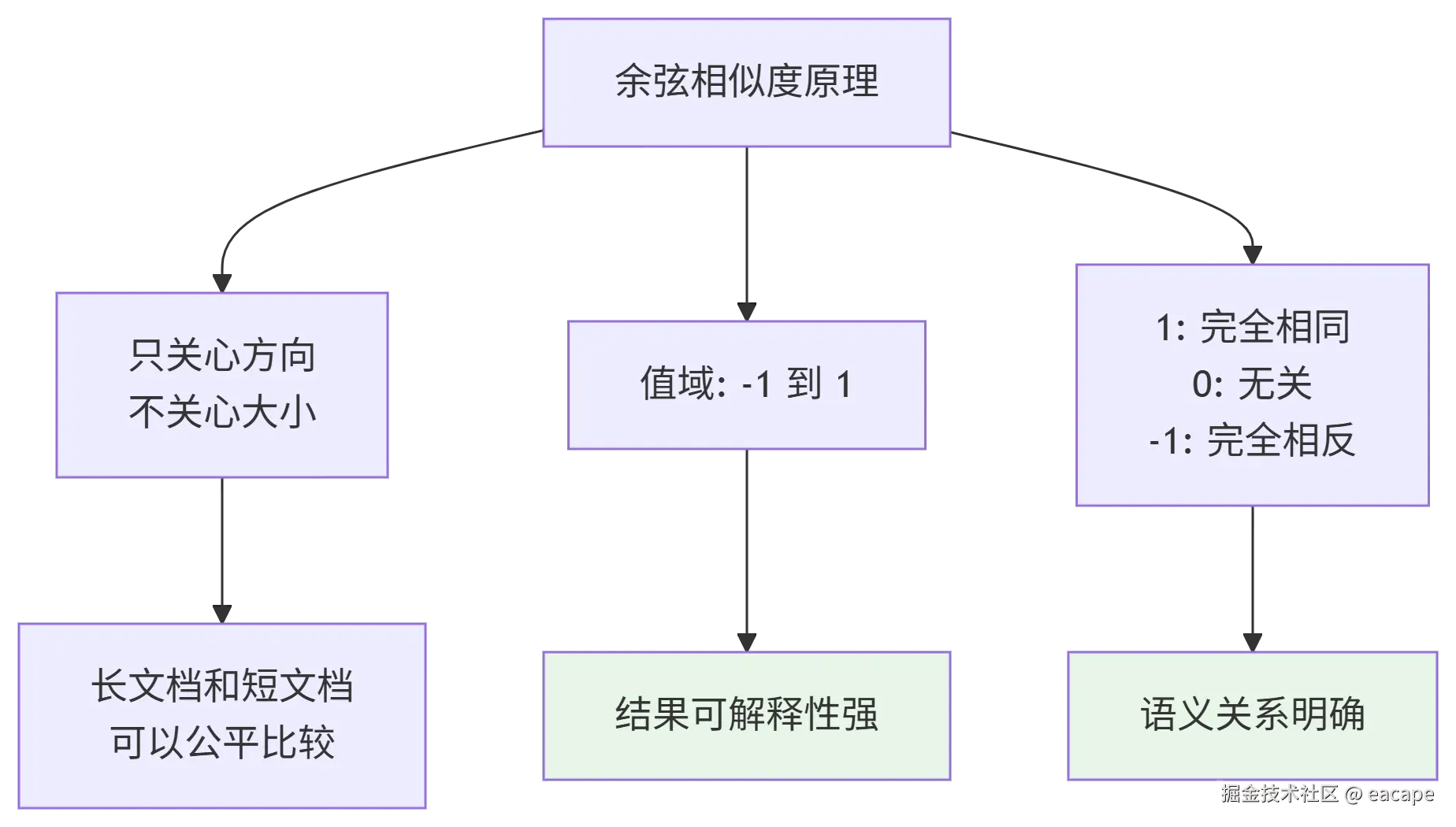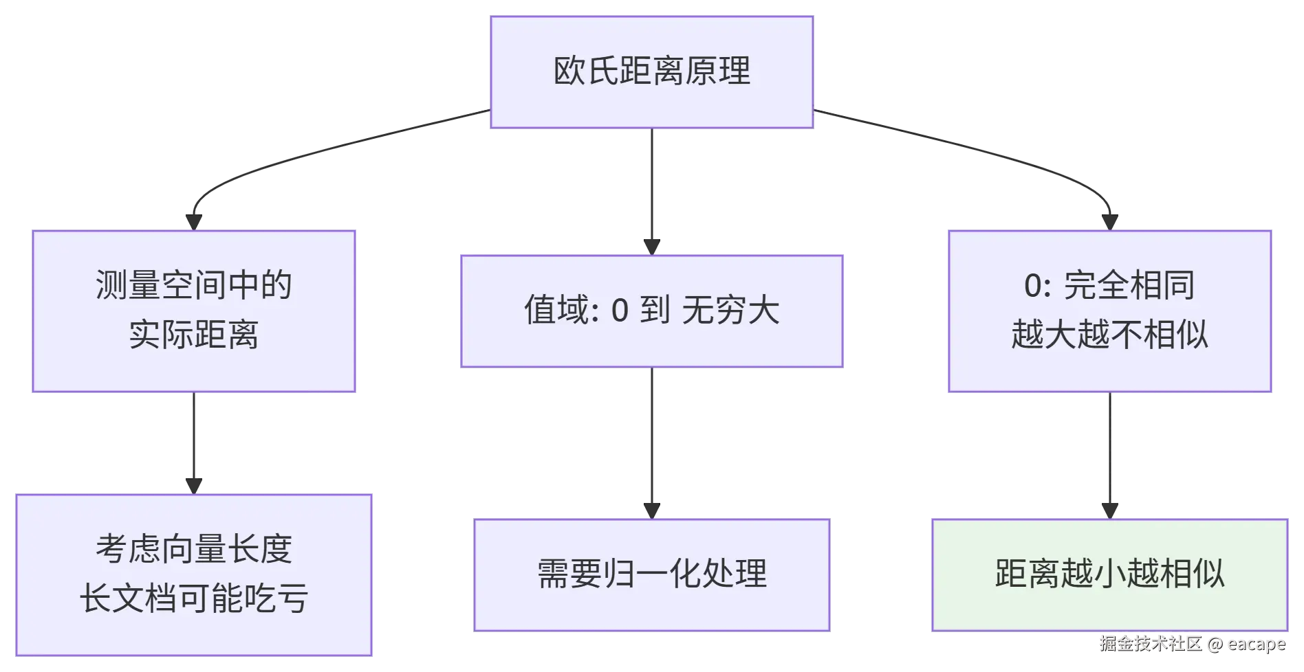 在语义空间中测量"直线距离",公式为:距离 = √[(A₁-B₁)² + (A₂-B₂)² + ... + (Aₙ-Bₙ)²]