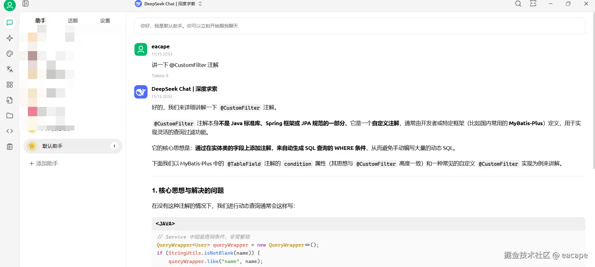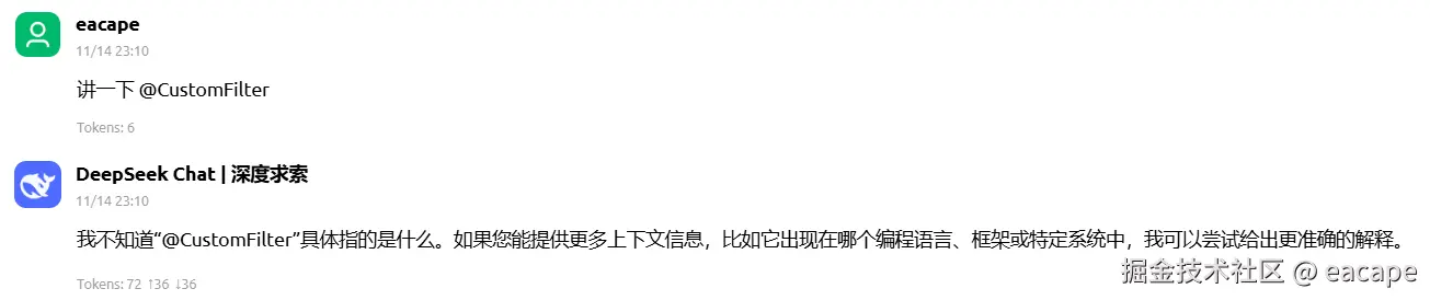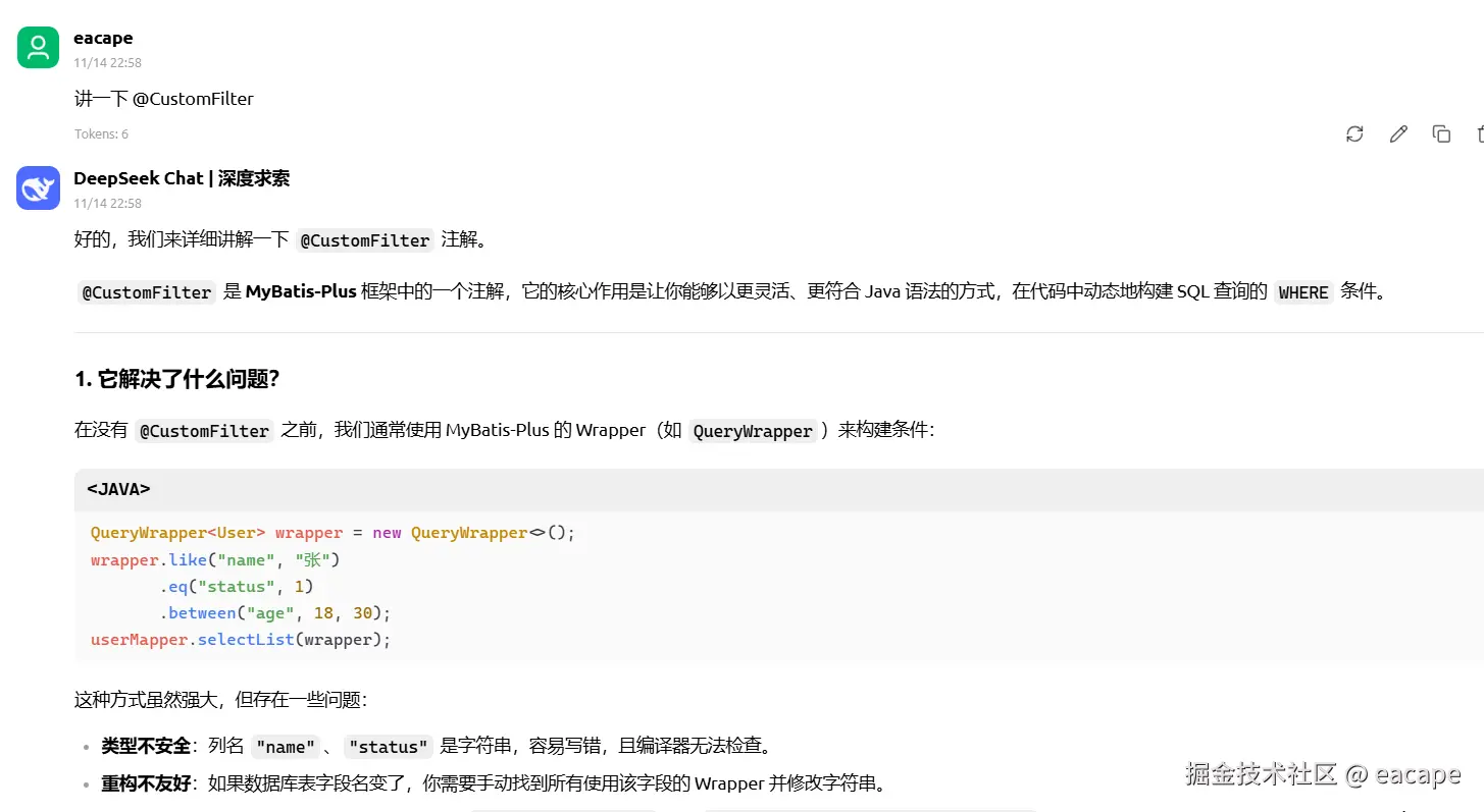 比如~我的代码里有一个名为@CustomFilter注解,这个注解大模型肯定不知道吧....下面是大模型的回答,我搜了下 Mybatis-Plus 并没有这个注解。