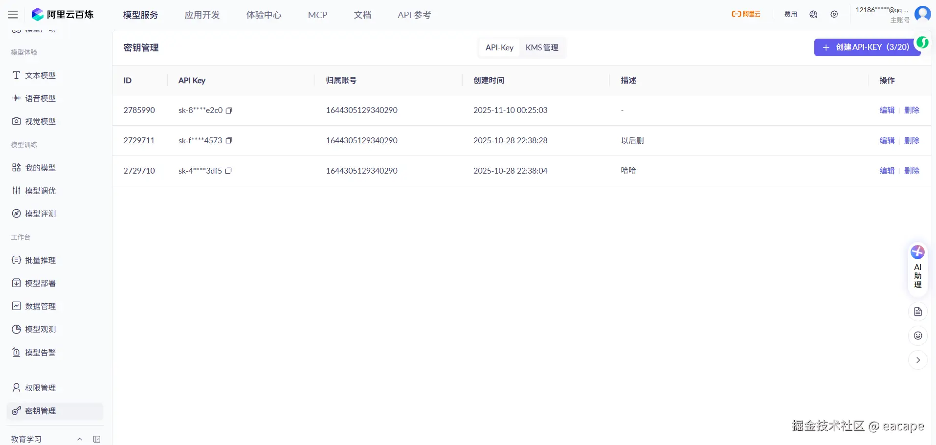 为什么选择阿里百炼?其实现在的 LLM 差距并不大,我们选择哪家都可以,最主要的百炼平台上有向量模型,我们从上面取一份密钥就可以直接用 LLM 和向量模型啦,比较方便一点(也许腾讯云、百度飞桨、字节火山也会有,但是我并不知道......这个随意)