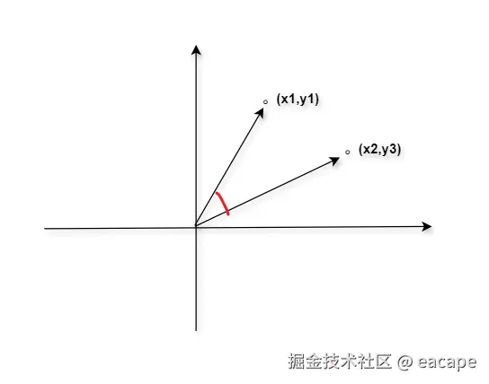 其实就是高中学的计算两个点与原点形成的夹角的余弦值 ,比如说已知平面内两个点 X (x 1,y 1) 和 Y (x 2,y2),我们就是要计算,这两个点与原点的连接线的夹角的余弦值,最终也是值越大的越相似。