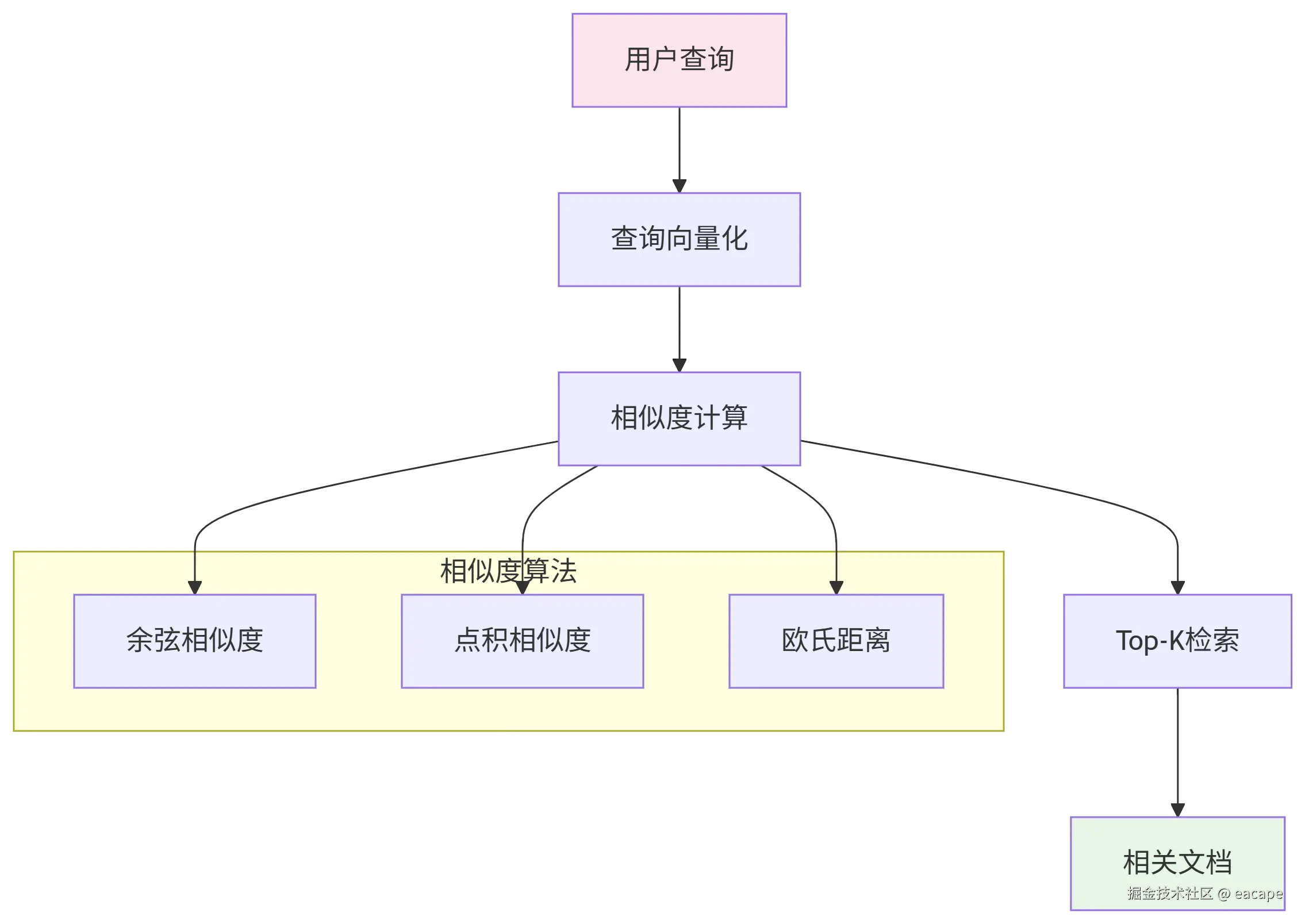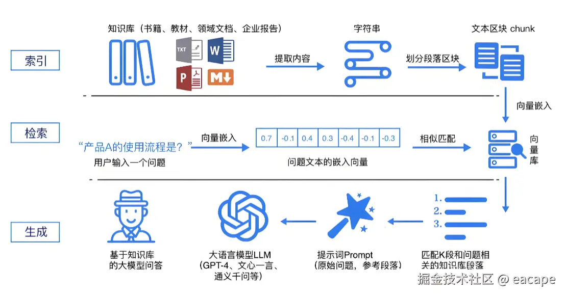 - 返回相似度最高的K个文本块(前面我们讲了向量和文本块是一种key-value结构,我们搜索到了向量,就找到文本块,这里向量起到的是一个索引的作用)