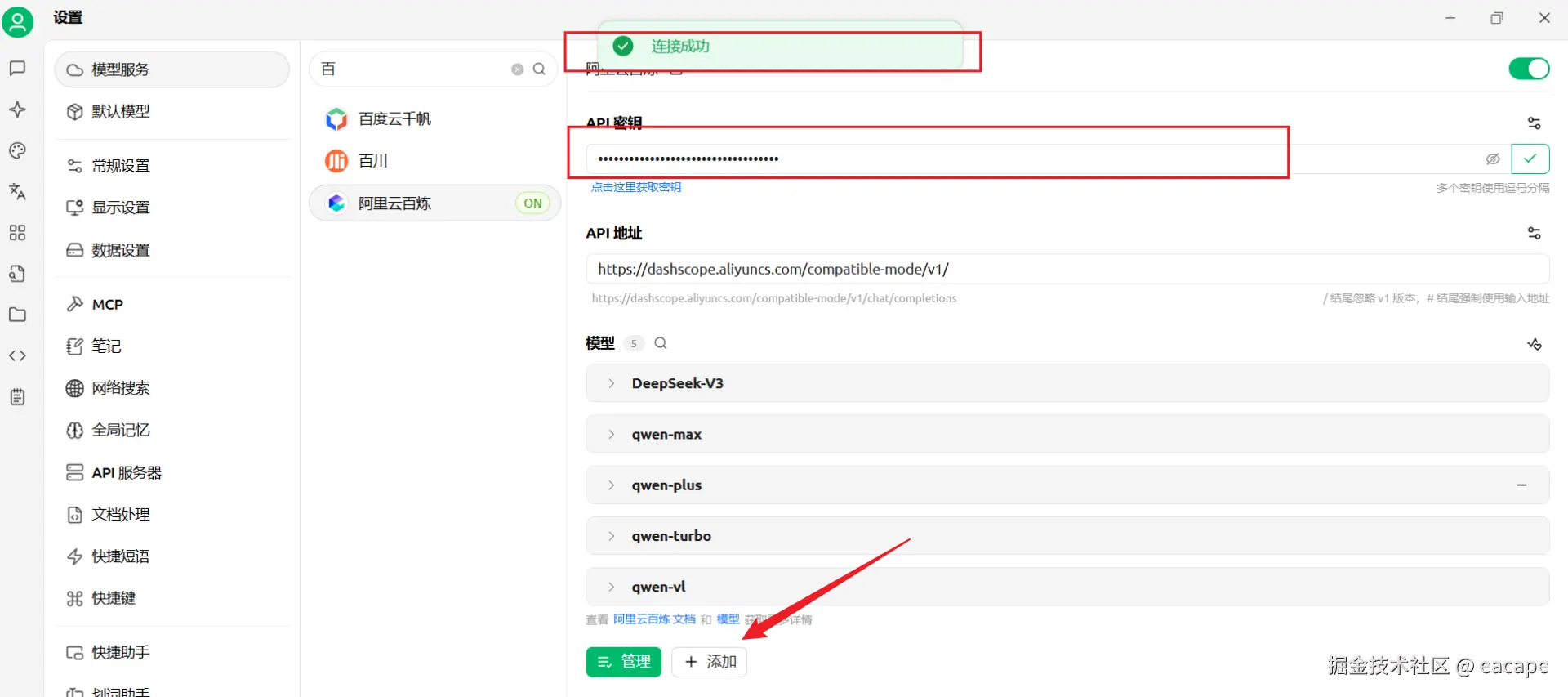 首先,在模型服务中搜索到"阿里云百炼",然后填充好刚刚复制好的密钥,检测成功即可