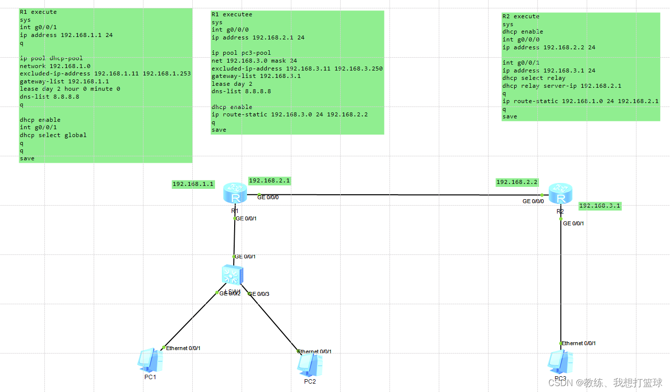1个路由器配置一个子网的dhcp服务+2个路由器配置dhcp服务器+dhcp中继器配置两个子网的dhcp服务
