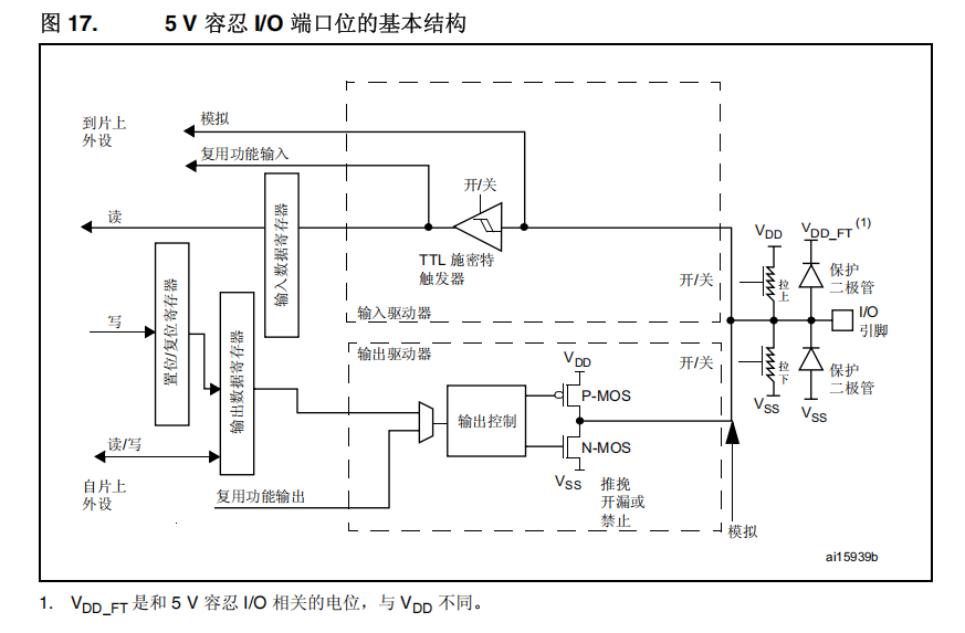 注意: 在模拟配置中,I/O 引脚不能为 5 V 容忍。