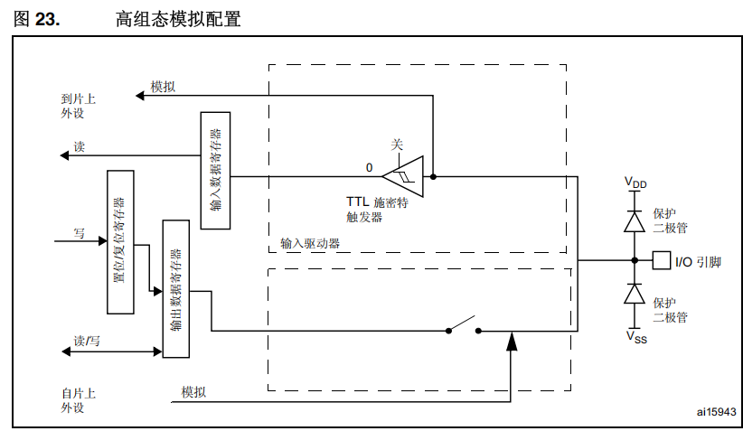 ● 施密特触发器输入停用,I/O 引脚的每个模拟输入的功耗变为零。施密特触发器的输出被