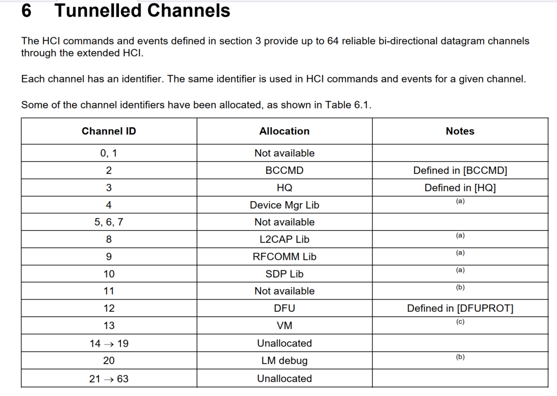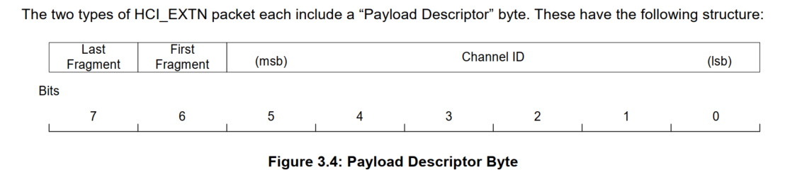 当我们整包数据没有被拆分时Last Fragment 喝 First Fragment 都为1 channel ID 参考下表,我们目前使用的是BCCOMMAND 。channel ID就是2 所以整个 Payload Descripto 就是 0xC2(1100 0010).