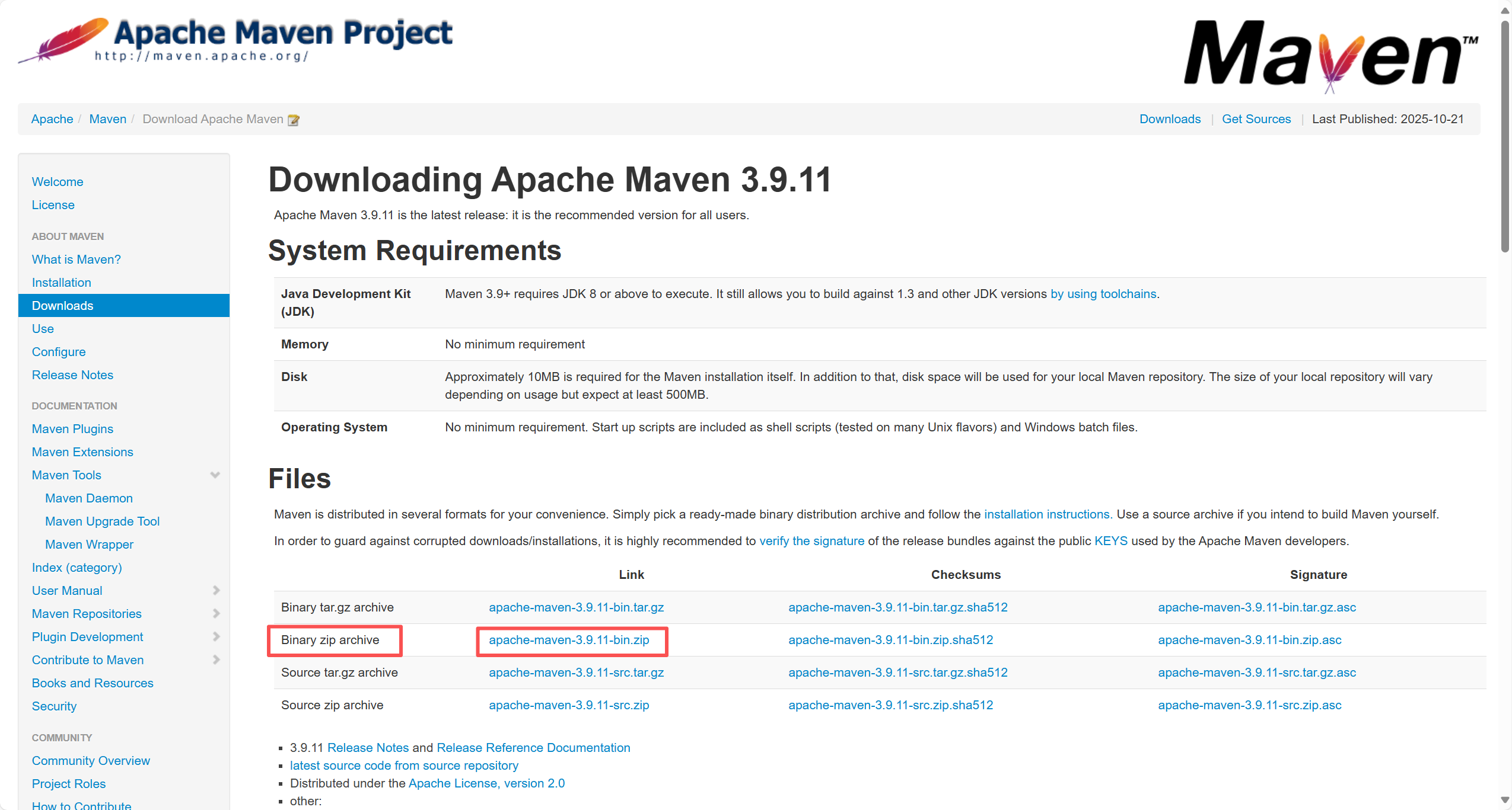 下载地址:https://maven.apache.org/download.cgi,选择"Binary zip archive " 的 Linke。