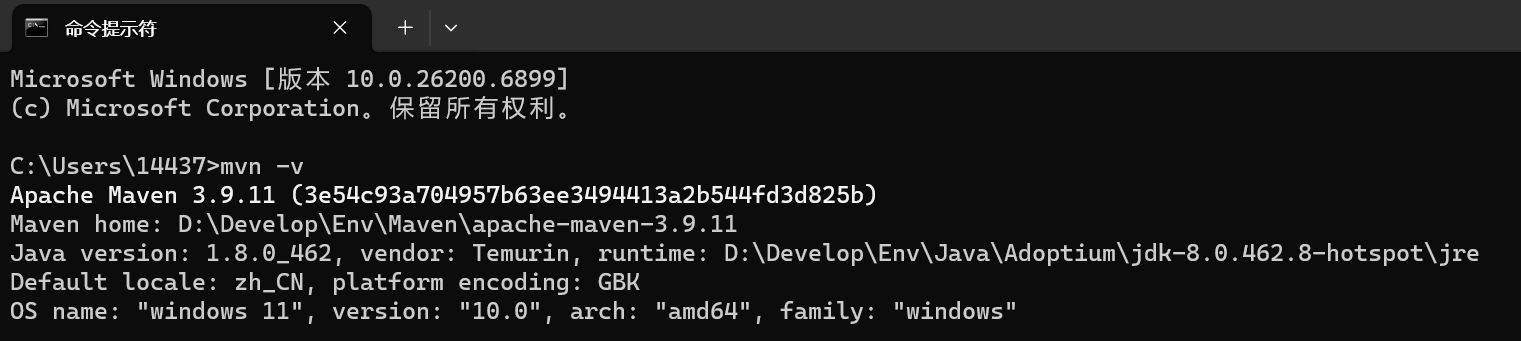 打开新CMD,输入mvn -v,显示Maven版本及Java环境关联信息即为成功。