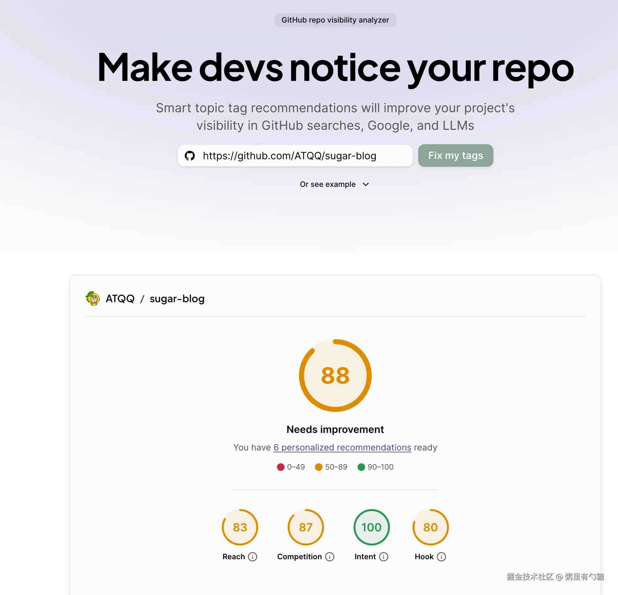 这个免费的工具可以对你的仓库进行分析,提供主题标签建议和其他推荐的行动项,帮助开发者更容易地找到你的项目。