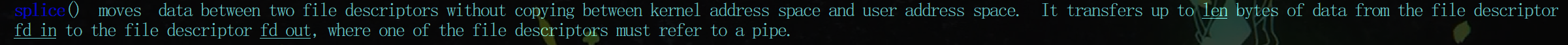 `splice()` 函数在两个文件描述符之间移动数据,而无需在内核地址空间和用户地址空间之间进行复制。它从文件描述符 `fd_in` 向文件描述符 `fd_out` 转移最多 `len` 字节的数据,其中其中一个文件描述符必须指向一个管道。