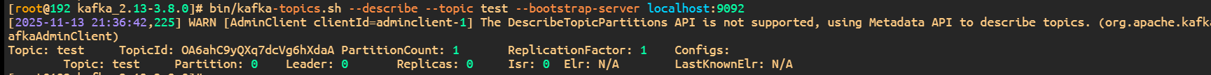 bin/kafka-topics.sh --describe --topic test --bootstrap-server localhost:9092 -- 查询topic
