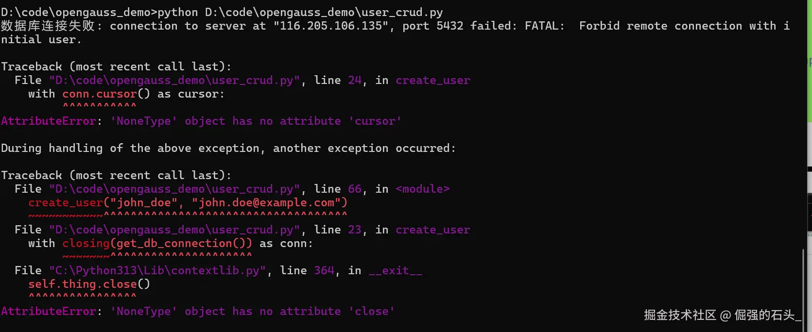 YOUR_SERVER_IP与Gauss@123456替换为真实值;若脚本报NoneType错误,通常是连接失败导致返回None。 - 端口连通性:Windows 执行