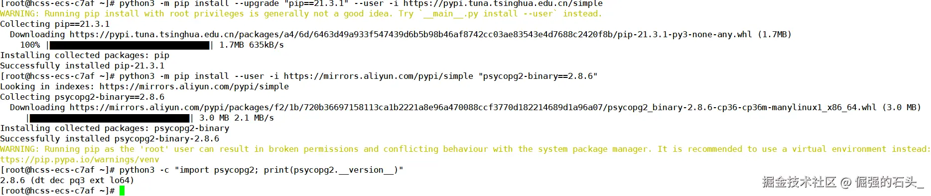 提示:尽量使用 python3 -m pip(或 pip3),并在非虚拟环境下加 --user 以避免权限冲突;若需源码编译,可改为安装 psycopg2==2.8.6,并提前安装构建依赖(如 gcc、python3-devel、postgresql-libs/postgresql-devel)。