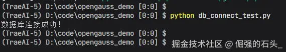 连接openGauss数据库非常简单,只需提供主机、端口、用户名、密码和数据库名即可。下面的示例与入门篇默认参数保持一致(请替换为实际的服务器IP与密码)