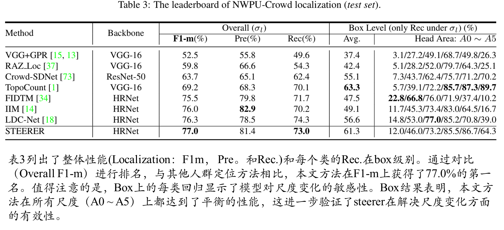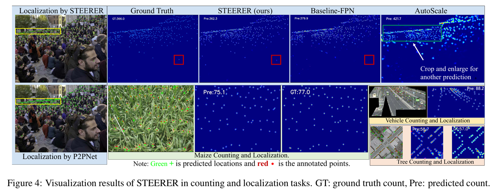 图4展示了实际场景下密度图的质量和定位结果。在人群场景中,与AutoScale相比,STEERER和基线模型在生成密度图方面都表现出更高的精度。在物体定位方面,与基线和P2PNet相比,STEERER在检测大型物体方面表现出更强的泛化能力,如图4中的红框部分所示。此外,STEERER在识别小而密集的物体方面保持了其有效性(见图4黄框部分)。所提出的STEERER模型具有跨不同领域的可移植性,例如车辆、树和玉米的定位和计数。