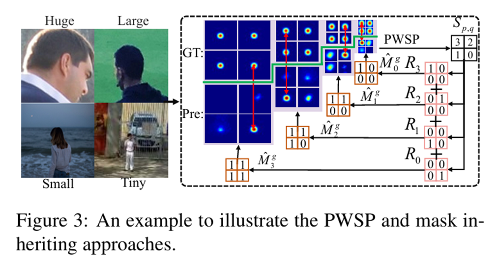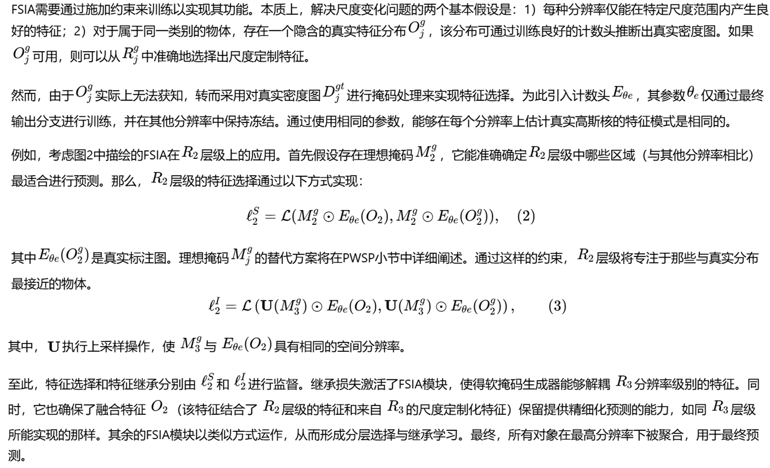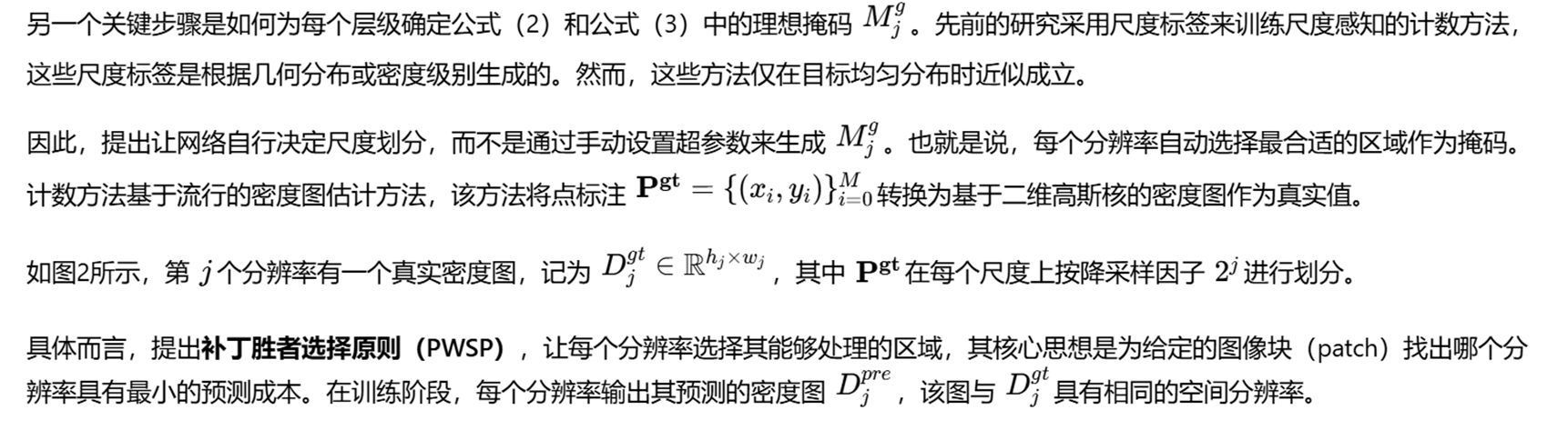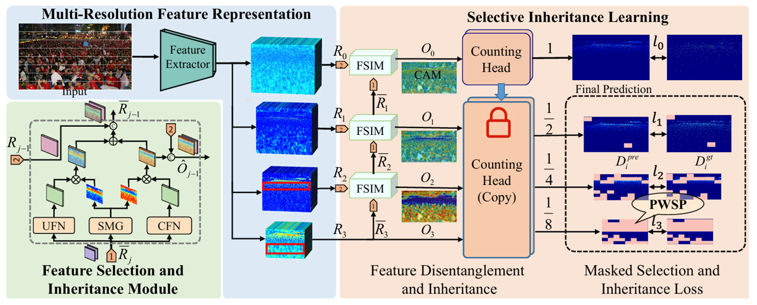 如图2所示:在选择性继承学习的监督下,采用FSIA将多尺度特征从最低分辨率融合到最高分辨率。使用CAM方法来显示了每个尺度上的熟练区域。Inference只使用最高分辨率的预测图。密度图中的掩蔽斑块表示它们在损失计算过程中被忽略。