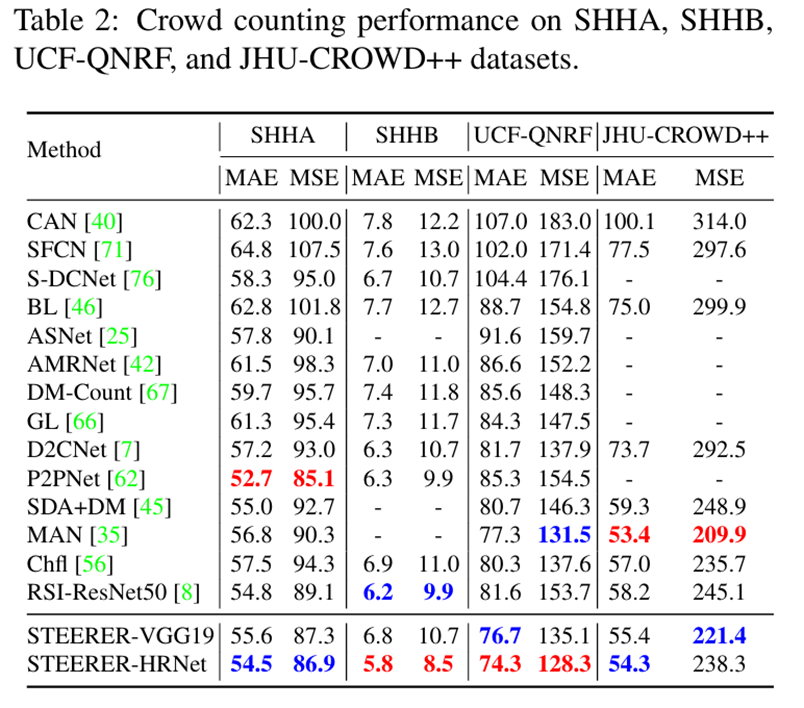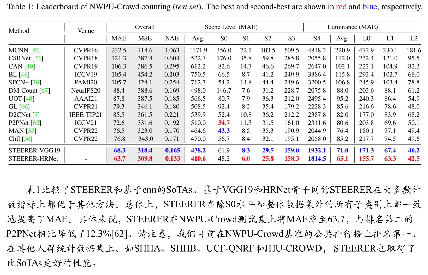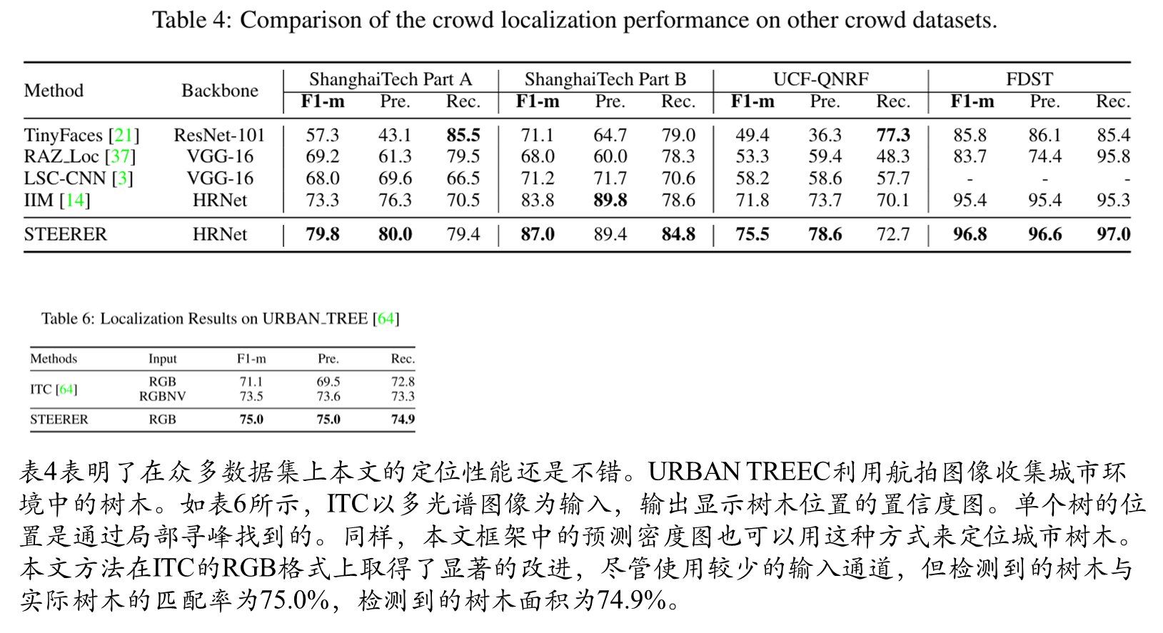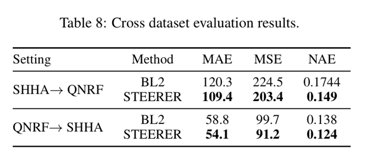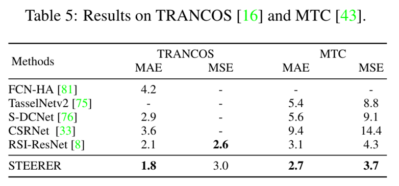 表5显示,直接应用STEERER评估车辆(TRANCOS)和玉米计数(MTC)时效果良好。对于车辆计数,我们进一步降低估计MAE。对于植物计数,我们的模型优于其他SoTAs,它们的MAE和MSE分别下降了12.9%和14.0%,显示出显著的改进。
