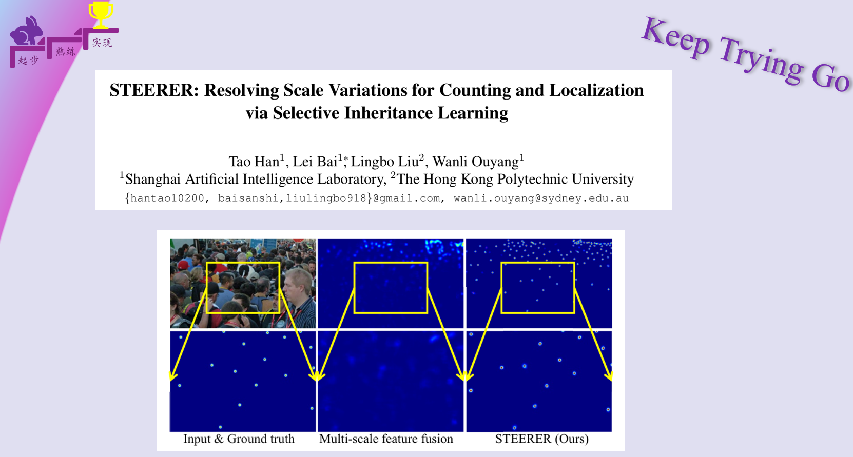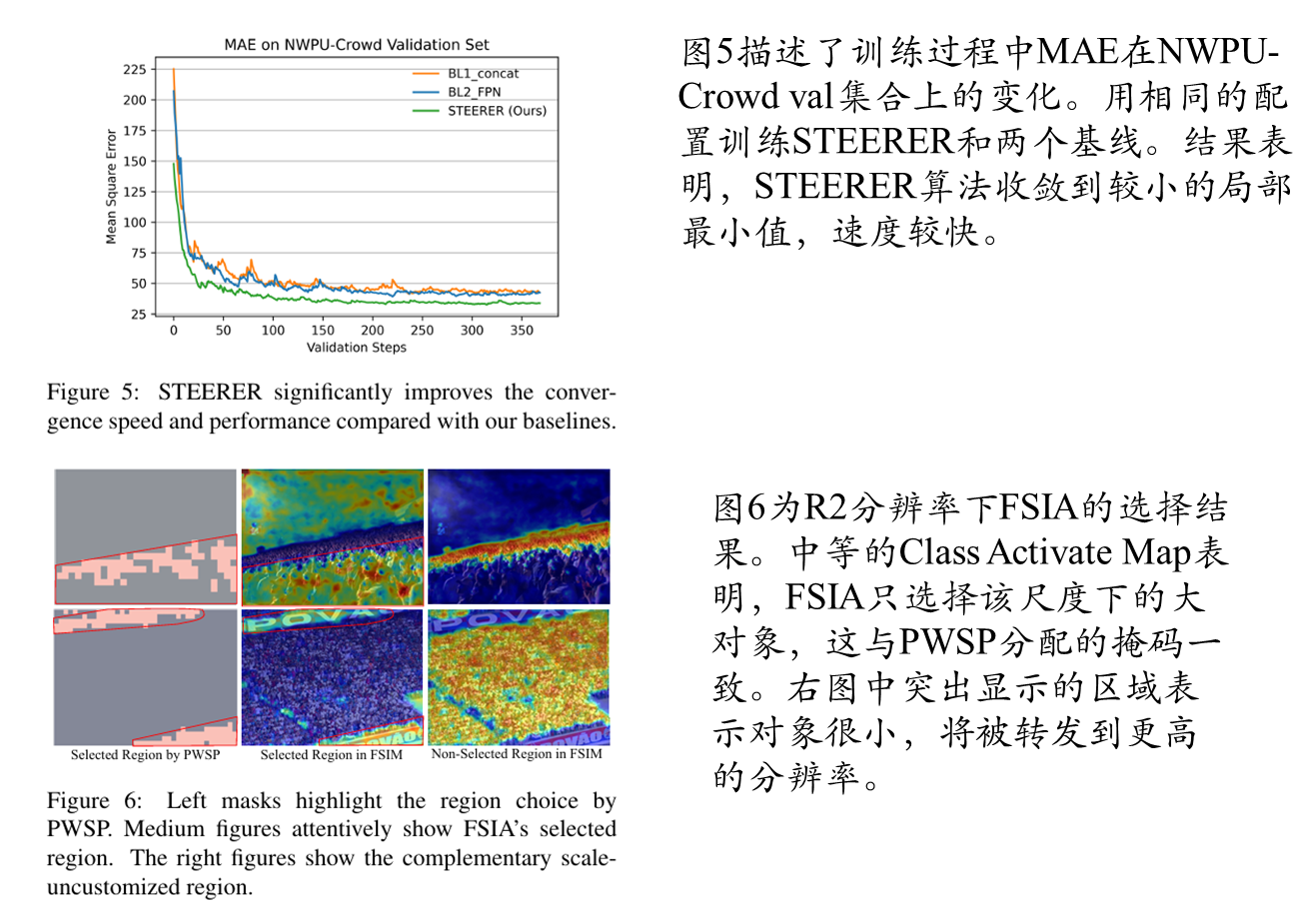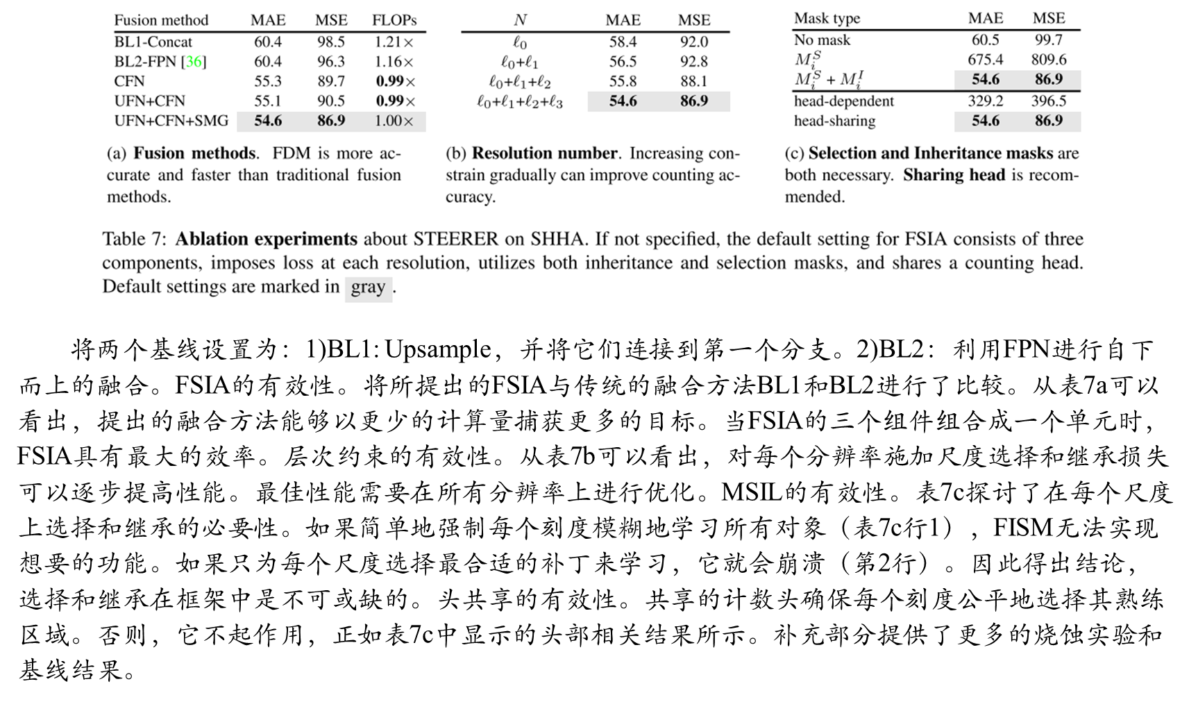 本文提出STEERER模型,通过选择性继承学习实现多尺度特征融合。模型采用FSIA算法从低到高分辨率融合特征,并使用CAM方法显示各尺度特征区域。实验表明,该模型在人群计数,车辆(TRANCOS)和玉米计数(MTC)任务中表现优异。可视化结果显示STEERER在生成密度图和定位方面优于基线模型,尤其擅长检测大型和小而密集的物体。跨域测试证实模型具有良好可移植性,适用于车辆、树木等多种场景的定位和计数任务。