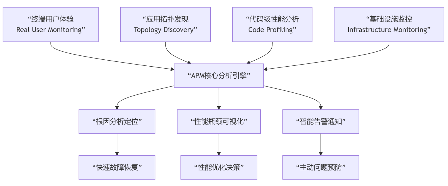 APM工具通过多个维度的数据采集和分析,构建了完整的应用性能可观测性体系,其核心组成与数据流向如下图所示: