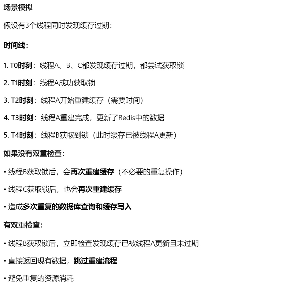 这里说明一下大家都会存在的疑问,为什么这里我们不用考虑缓存穿透问题了(前面,咱们已经说过缓存穿透是,我们要查询的数据在redis、数据库当中都不存在,这时所有请求压力都打到数据库,给系统造成了崩溃),而缓存击穿的原因就是在高并发情况访问下,大量并发请求同时访问失效的热点key,导致压力全部到达数据库,压垮数据库。而我们针对的就是热点key问题,需要提前做缓存预热(预先将高频访问数据加载到缓存中),如果未命中说明不是热点数据,直接返回null,所以根本不会走数据库!