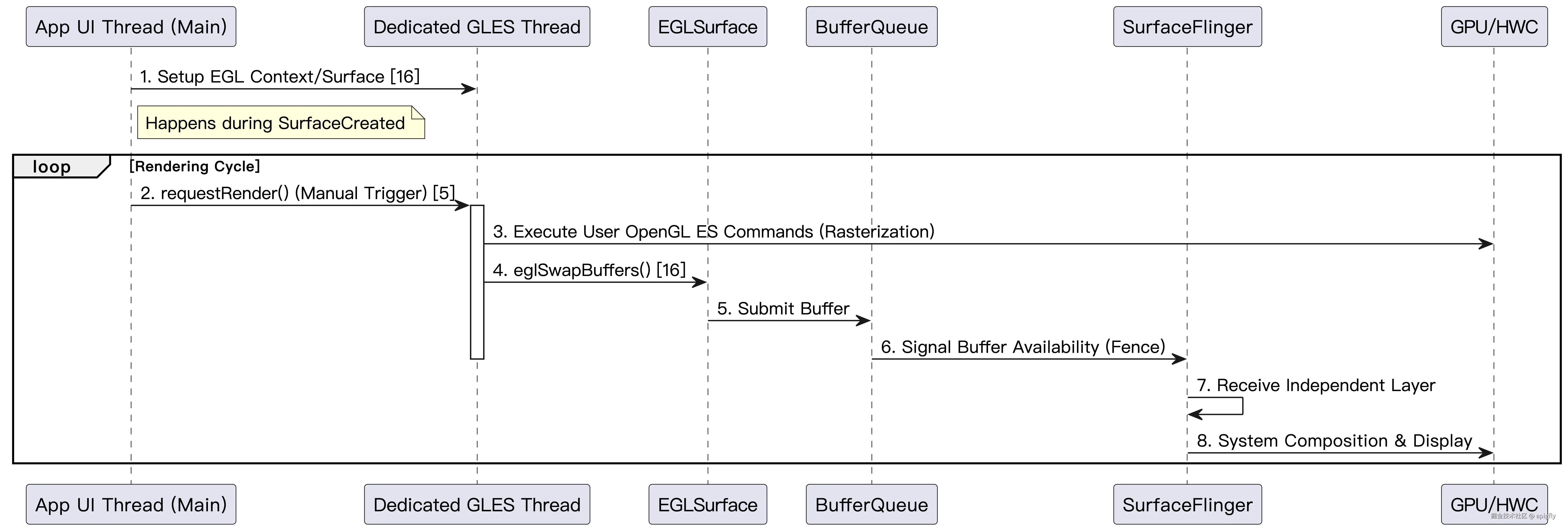GLES线程设置EGL环境,创建EGLContext和EGLSurface实例。 - Application UI Thread -> Dedicated GLES Thread: UI 线程通过事件或动画循环,触发 GLES 线程调用