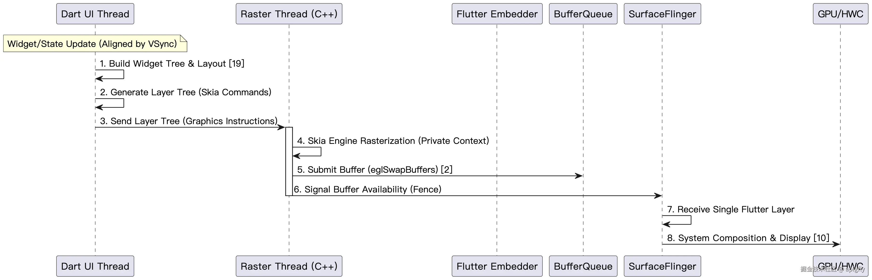 - Dart UI Thread (Engine): 在 VSync 信号开始时,执行 Layout 阶段,计算 Render Tree,最终生成包含 Skia/Impeller 绘图指令的 Layer Tree。