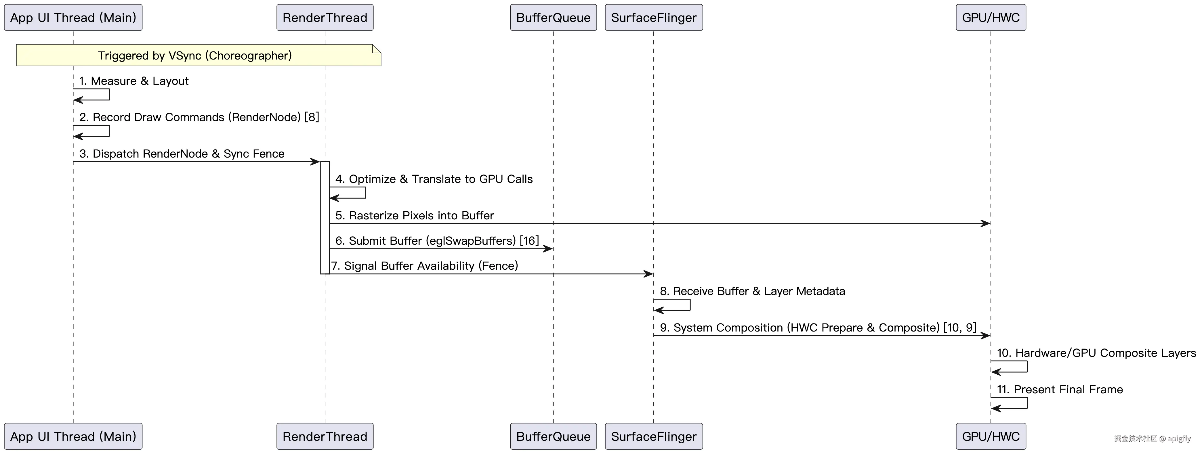 - Raster Thread -> SurfaceFlinger (System): 提交应用 Surface 缓冲区,作为单一 Layer 提交给系统。