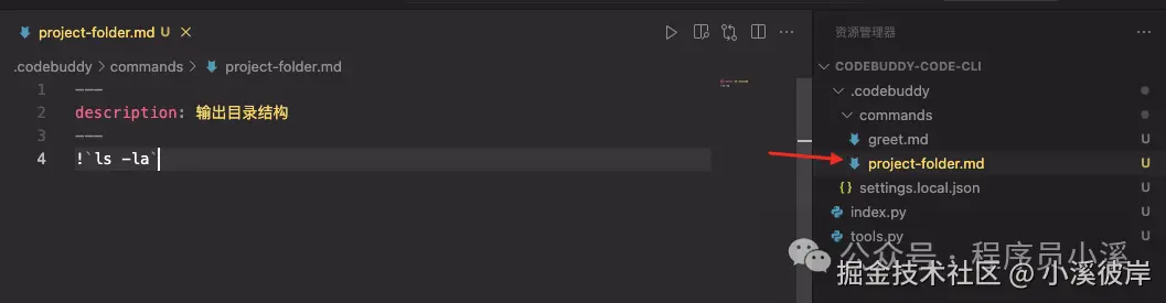 首先在项目根目录创建 .codebuddy/commands 文件夹,在文件夹中创建一个 project-folder.md 文件,输入如下提示词: