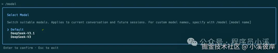 在交互式命令中输入 /model 可以查看模型信息,提供了 Default(暂时未知模型信息)、DeepSeek-V3.1、DeepSeek-V3 3种模型