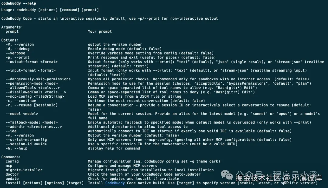 在命令行输入 codebuddy --help 可以快速查看CodeBuddy Code CLI提供的参数,包含 命令 和 可选参数。可以看到和CodeBuddy Code CLI很像哈。