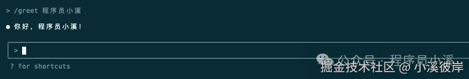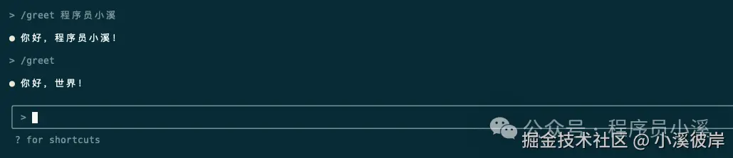 保存后,重启CodeBuddy Code CLI,输入 /greet 使用【Tab】补全指令输入参数