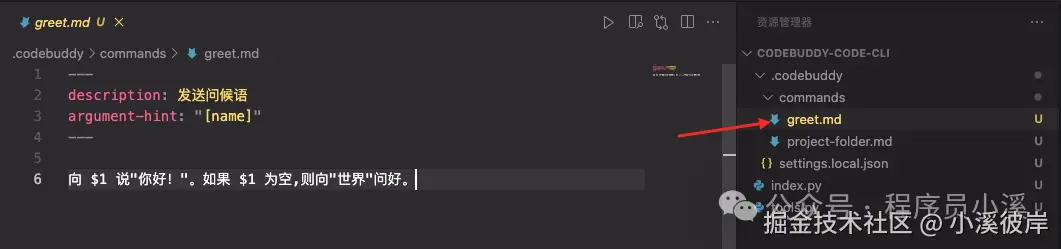 CodeBuddy Code CLI自定义命令也支持自定义动态参数,在文件夹中创建一个 greet.md 文件,输入如下提示词: