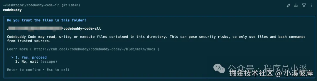 CodeBuddy Code CLI安装成功后,在命令行终端输入 codebuddy 即可启动,首次使用需要对文件夹进行授权操作