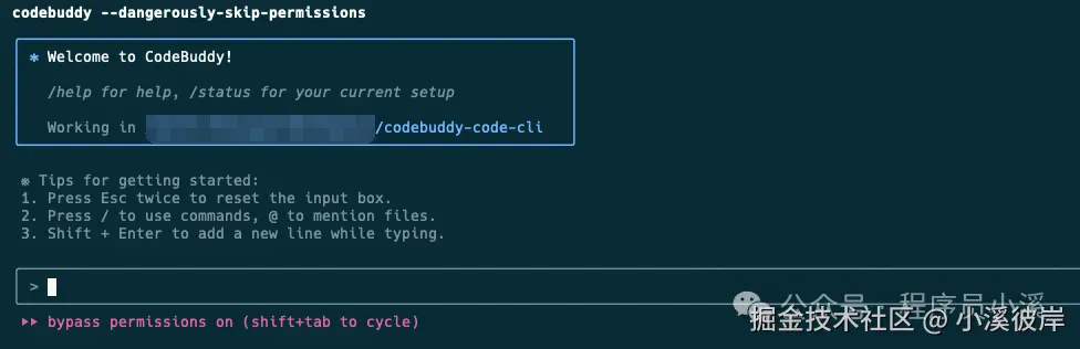 使用 codebuddy --dangerously-skip-permissions 开启自动允许模式,类似Cursor中的 auto-run 模式