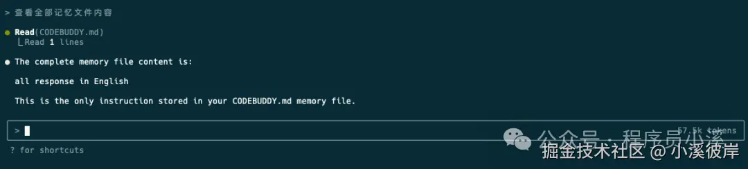 首先创建 ~/.codebuddy/CODEBUDDY.md 和 项目根目录/CODEBUDDY.md 两个记忆文件,在 ~/.codebuddy/CODEBUDDY.md 输入提示词: