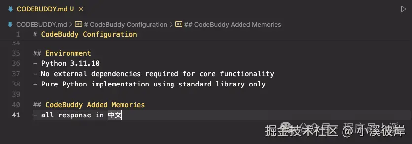 当你运行 /init 命令时,codebuddy 会自动为你生成一个 CODEBUDDY.md