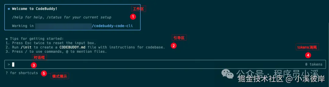 启动CodeBuddy Code CLI后界面如下,提供了对话模式、工作区和tokens消耗信息展示