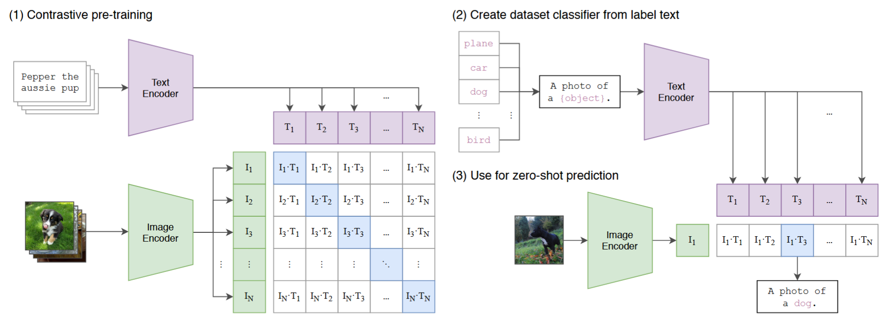 (1)当图像模型使用图像特征提取器 和线性分类器 来预测某些标签时,CLIP结合图像编码器和文本编码器来预测一批(图像、文本)训练示例的正确配对 。在测试时,(2,3)经过训练的文本编码器通过嵌入目标数据集类的名称或描述来合成零样本线性分类器。