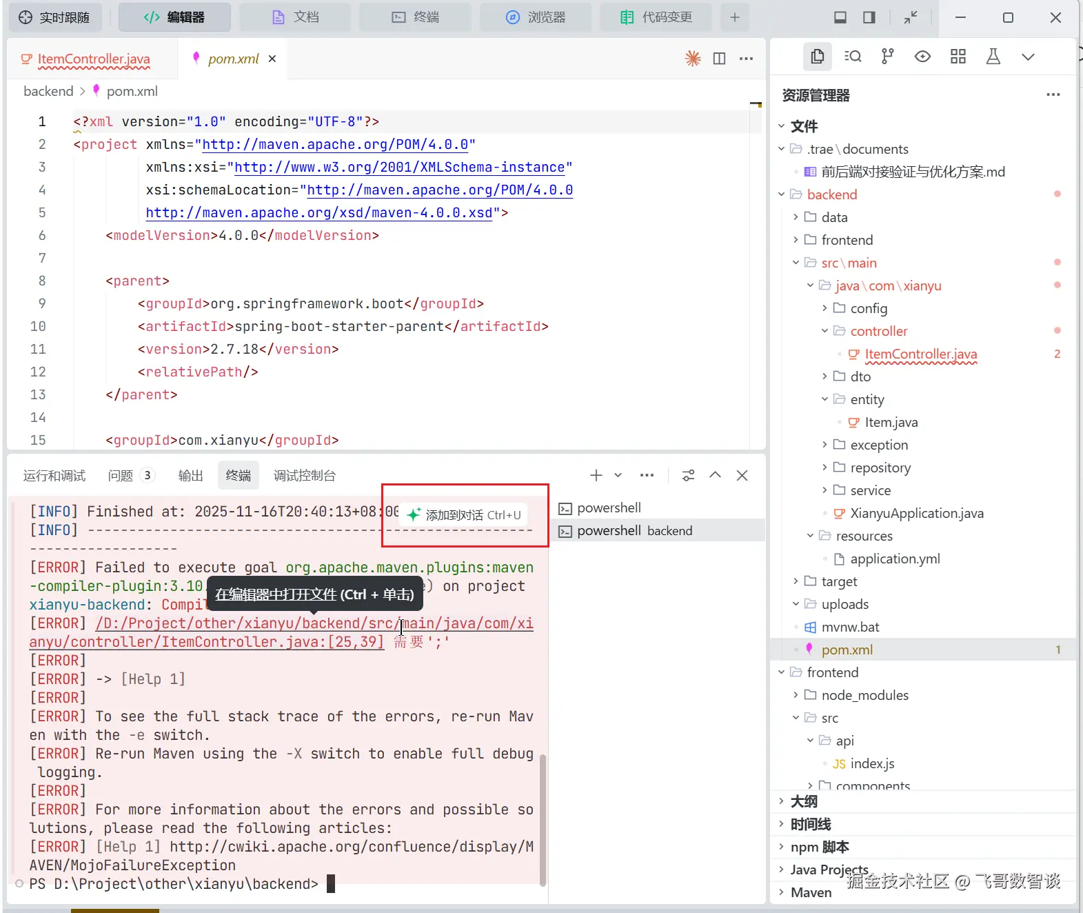 后台在终端里面的编译错误,可以直接添加到对话。