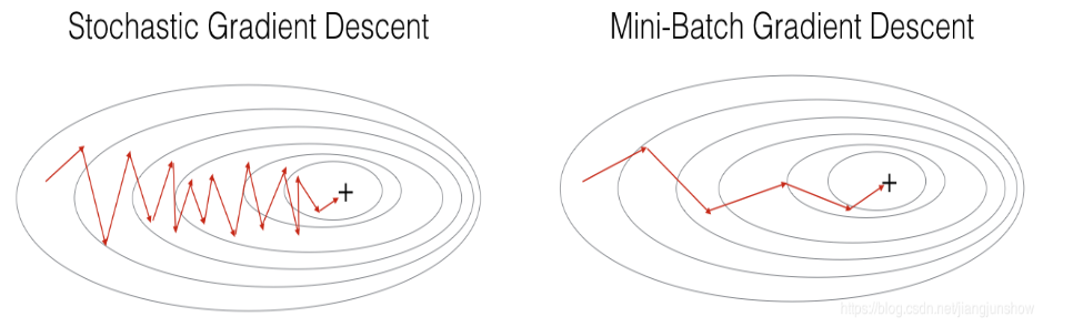- 左图(SGD):路径跳跃剧烈,噪声大;