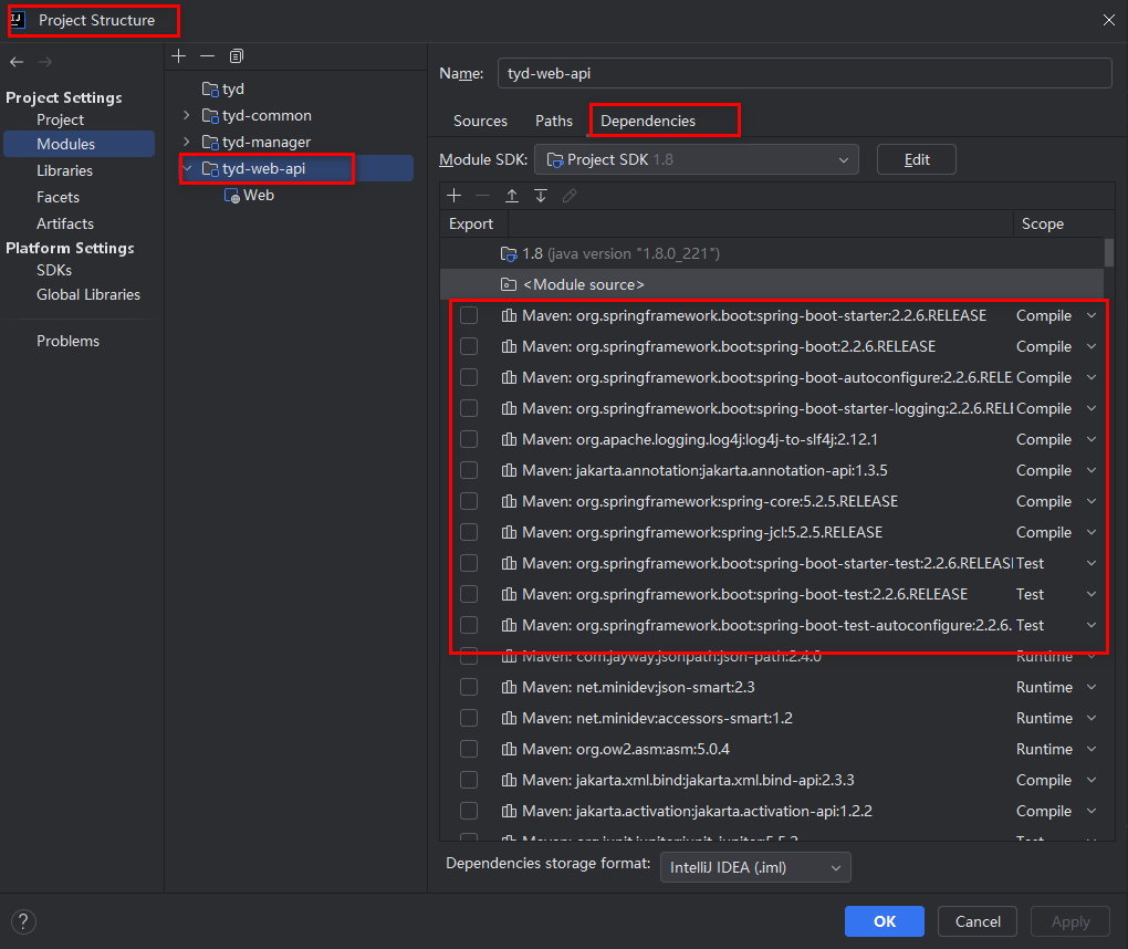 类路径(Classpath)是 Java 虚拟机(JVM)用来查找类文件、资源文件和依赖库的路径集合。在 Spring Boot 项目中,类路径的配置直接决定了应用能否正确编译、运行,以及依赖是否被正确加载。通过 File > Project Structure > Modules > Dependencies,查看模块的类路径配置,如下: