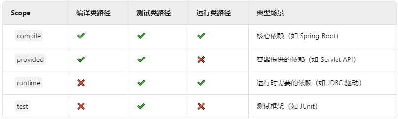 Maven 的 <scope> 标签决定了依赖在不同阶段是否加入类路径: