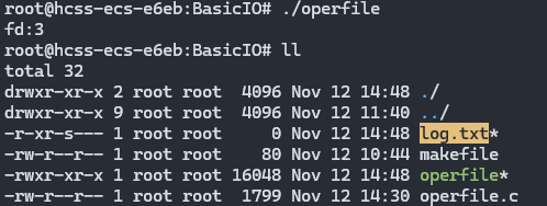 运行前,当前目录下只有 makefile,operfile,operfile.c;运行程序后,目录中新增了 hello.txt,且文件内容为 5 行"hello : 数字"-- 这说明程序成功创建并写入了文件.